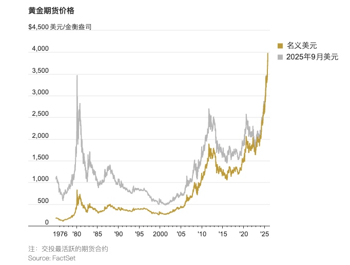 2025年黄金期货价格涨幅超过50%,超过了疫情期间和2007-09年衰退期间的涨势。自1979年通胀冲击以来,黄金从未在一年内出现如此大的涨幅。
