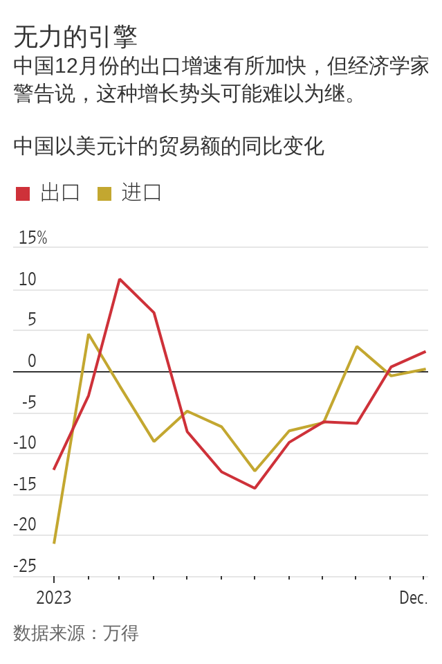 中国海关总署上周五公布的最新贸易数据凸显了部分此类风险。虽然中国12月份的出口势头有所回升,同比增长2.3%,但进口却表现疲软,表明中国消费者对消费仍持谨慎态度。