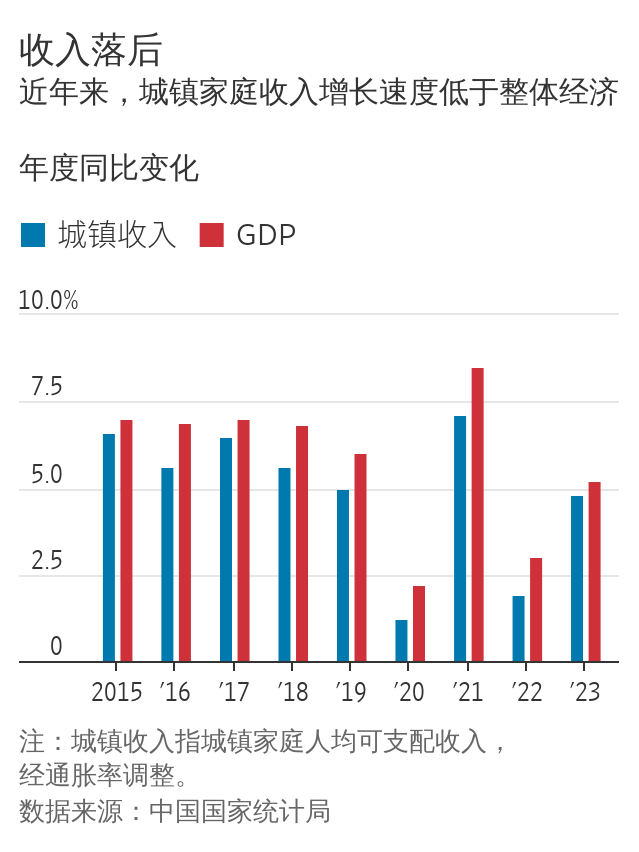 从官方数据来看,中国的工资仍在增长。但政府发布的数据显示,在经过通胀调整后,过去五年城镇家庭收入增速一直低于中国经济的整体增速。