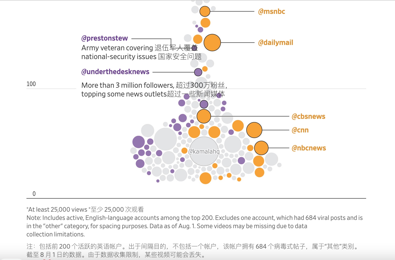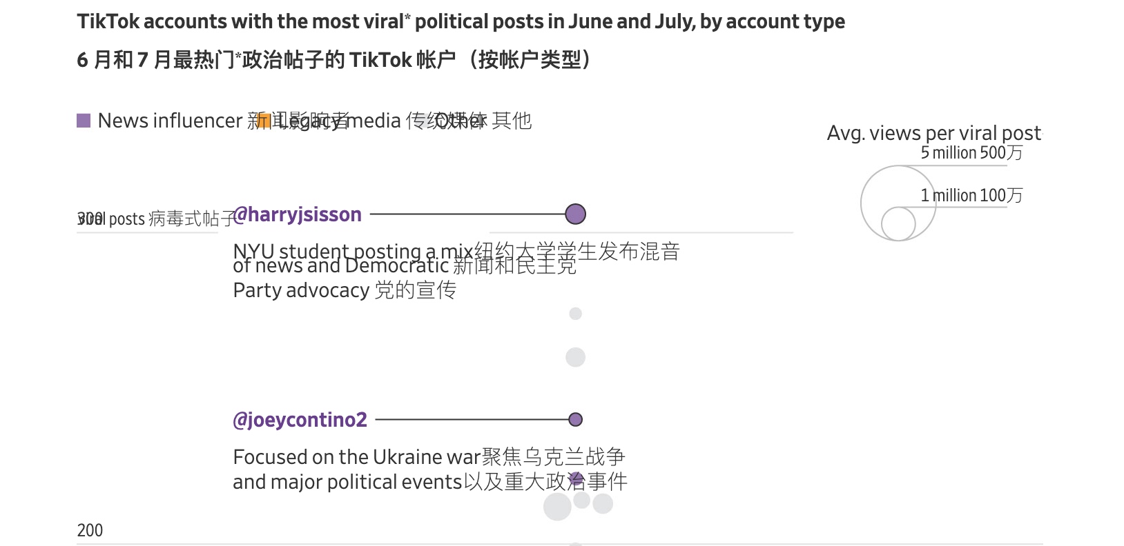 The Journal’s analysis covered the 200 accounts with the most viral political posts excluding those that were inactive or not English-language. The Journal categorized the accounts as news influencers, legacy outlets or others, such as politicians and comedians, based on criteria developed with several media researchers.《华尔街日报》的分析涵盖了 200 个最热门政治帖子的账户,不包括那些不活跃或非英语的账户。 《华尔街日报》根据与几位媒体研究人员制定的标准,将这些账户归类为新闻影响者、传统媒体或其他人,例如政客和喜剧演员。