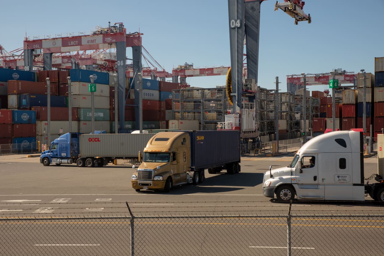 卡车驶离长滩集装箱码头。 照片: Allison Zaucha 为《华尔街日报》拍摄