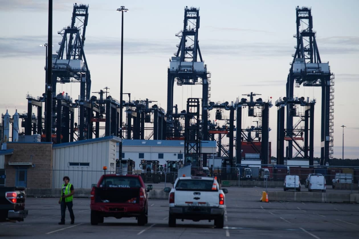 工人们上周抵达休斯顿港的 Bayport 集装箱码头。 照片: Mark Felix/Bloomberg News
