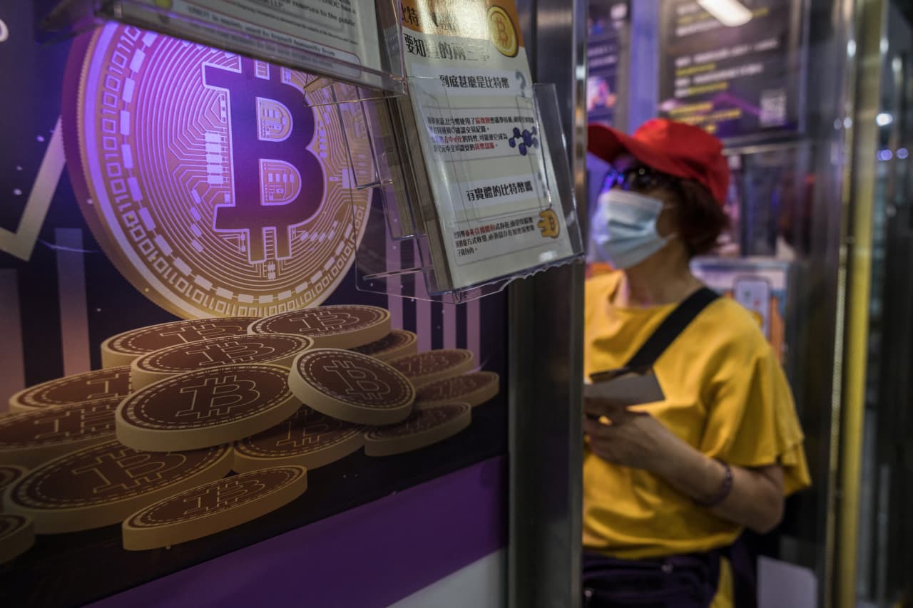 一名女性正在香港一家加密货币交易所与一名工作人员交谈。图片来源:dale de la rey/AFP/Getty Images