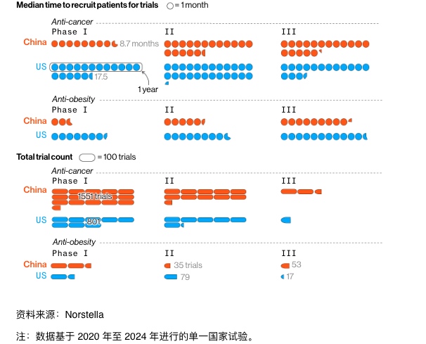 众所周知,从零开始研发一种新药耗时耗力,成本高昂,而中国庞大的患者群体和集中式医院网络成为重要的加速器。对药物各阶段测试所需时间的分析表明,中国医生可以更快地招募试验对象——对于癌症和肥胖症药物的早期试验,他们完成患者入组的时间是美国的一半。