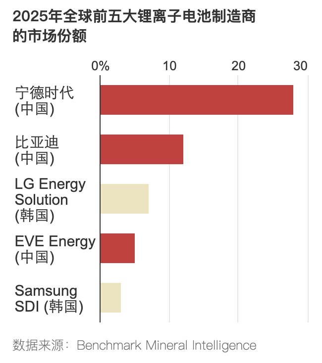 全球最大的两家锂离子电池生产商宁德时代(CATL)和比亚迪(BYD)都是中国公司。即便是非中国制造的锂离子电池中也包含大量中国元件。根据Benchmark Mineral Intelligence的数据,中国供应商生产全球电池正极材料的79%,负极材料的92%。锂离子电池还使用诸如锂等关键材料,而中国生产商在精炼化学锂产品领域的市场份额达63%。中国还控制着80%的精炼钴供应和98%的精炼石墨供应。
