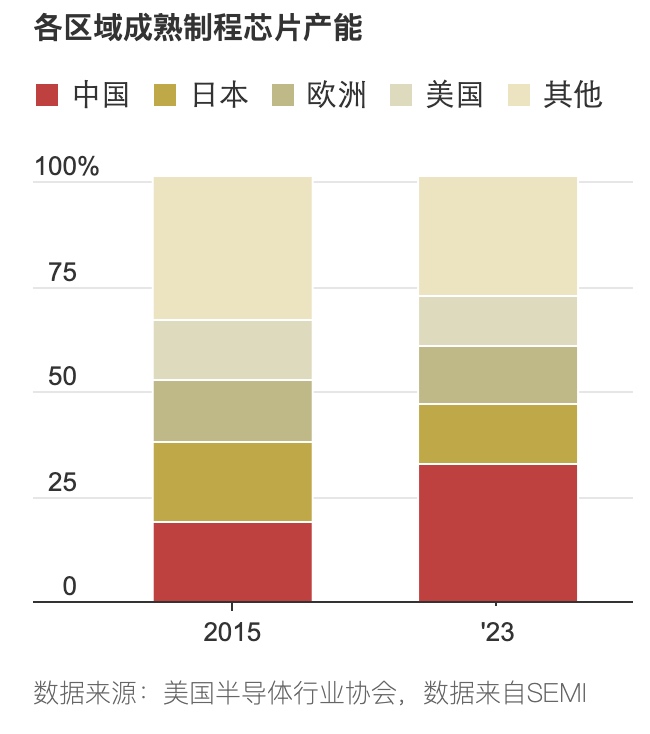 中国目前约占到全球成熟制程半导体产能的三分之一。尽管这些芯片比尖端芯片更容易生产,但对于汽车、消费电子和国防等行业仍至关重要。