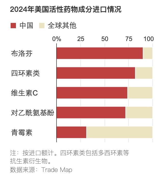 美国进口的大部分对乙酰氨基酚和布洛芬都来自中国。它们分别是泰诺(Tylenol)和Advil的活性成分。中国也是抗生素成分的重要生产国。