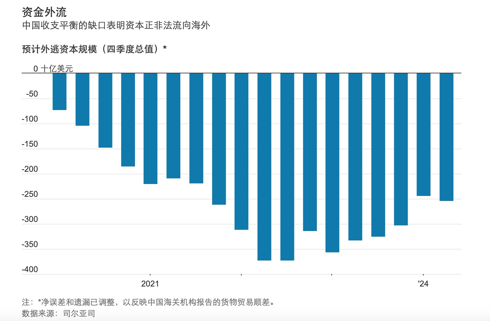 中国房地产市场崩盘和经济不确定性促使人们向海外转移资金。即使存在资本管制,在截至今年6月底的四个季度里,外流资金规模或多达2,540亿美元。